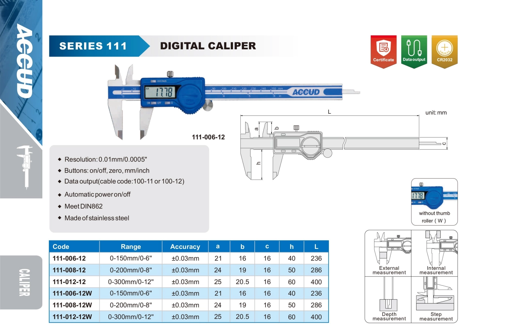 Přesnost odměřování +/- 0,03mm, automatické vypnutí při delší nečinnosti, baterie CR2032, výstup dat - možnost připojení k PC přes USB kabel.
