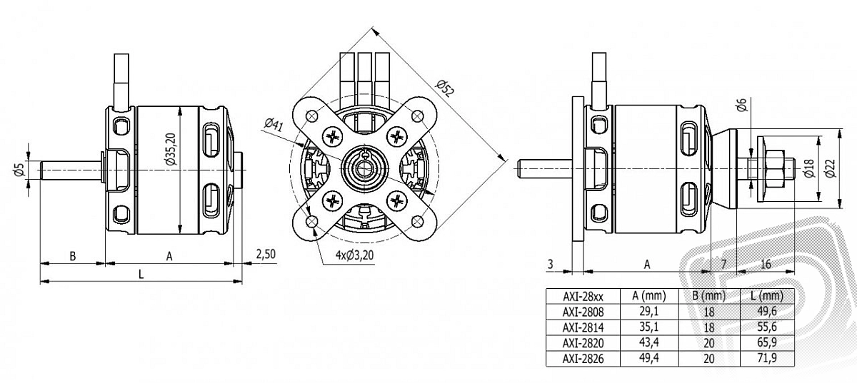 Montáž motoru: AXI 2808/20 V3 je konstruován pro přední i zadní montáž. Při přední montáži za čelo motoru použijte nejméně dva (protilehlé), nebo čtyři šrouby M3, které zasahují do čela motoru v rozmezí 3,5-4 mm. Motorová přepážka by měla být z 3 mm letecké překližky.