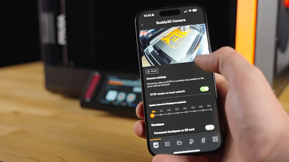 Pokud je vaše tiskárna umístěna v jiné místnosti, můžete streamovat video přes lokální síť přímo do aplikace Prusa App. V plánované aktualizaci hodláme tuto funkci rozšířit, aby podporovala plné online streamování. Firmware kamery se aktualizuje bezdrátově, takže máte vždy k dispozici nejnovější funkce.