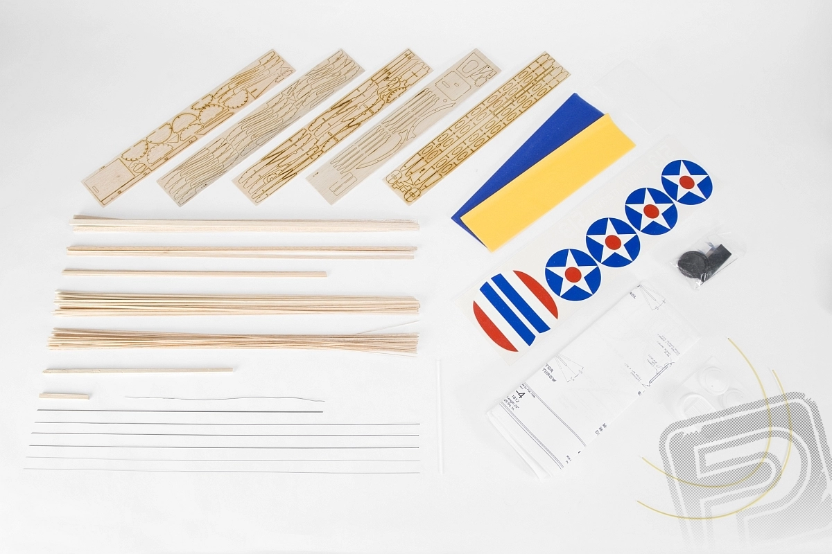 Stavebnice obsahuje: balsové laserem vyřezávané díly, balsové nosníky, vakuově lisované díly (kryt motoru...), čirou plastovou fólii na větrný štítek, ocelovou strunu na podvozek a další drobné díly, plastová kola, barevný potahový papír, aršík samolepek, stavební plán.