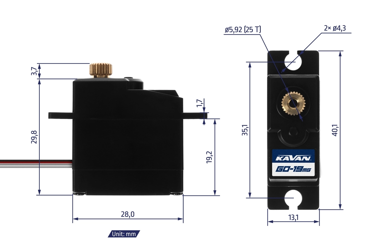 Digitální mikroservo 19g s kovovými převody pro elektrolety a větroně. Tah 1,8 kg/cm, rychlost 0,17s/60° při 4,8 V, tah 2,0kg.cm, rychlost 0,14s/60° při 6,0 V;rozměry 28x13,2x29,6 mm, napájení 4,8-6V.