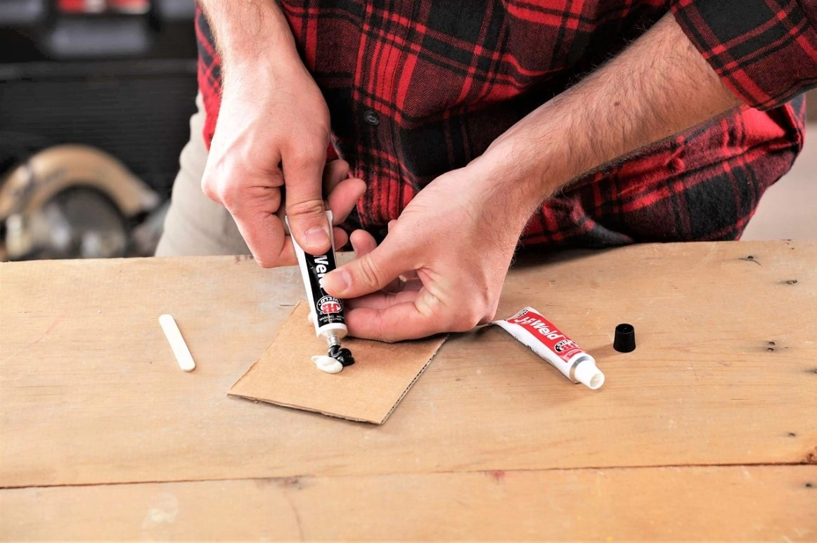 Vytlačte každou z obou složek ( poměrem 1:1 ) na misku, karton dřívko ču jiný předpřipravená jednorázový povrch a důkladně promíchejte pomocí "míchátka", abyste spojili dvě složky lepidla.