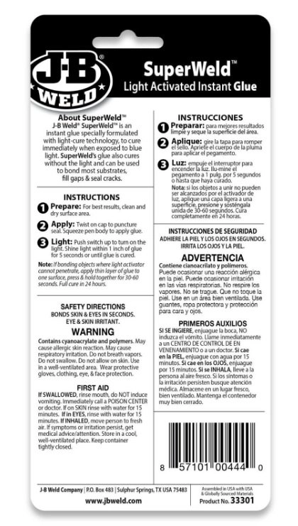 Vteřinové lepidlo SuperWeld™ aktivované UV zářením je speciálně vyvinuto tak, aby poskytovalo silný, okamžitý spoj a vytvrdlo během několika sekund.