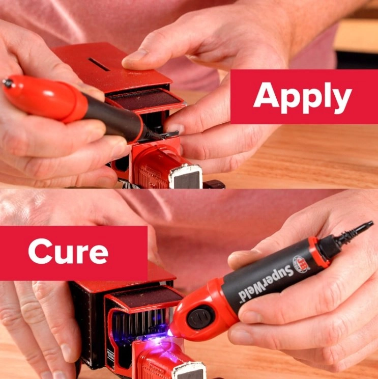Po nanesení na povrch posviťte modrým světlem a lepidlo během několika sekund vytvrdne, čímž vám poskytne okamžitou opravu na více površích.