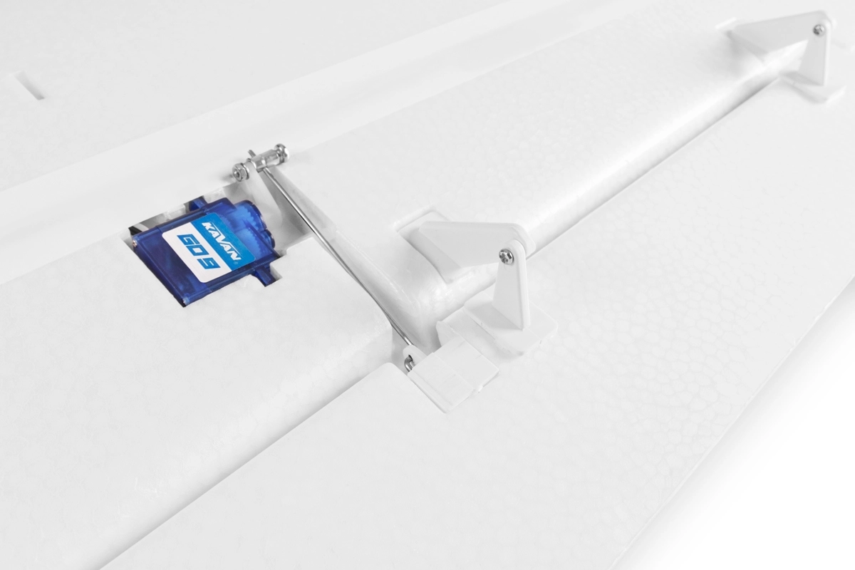 Křídlo modelu z pěnového EPO je dvojdílné s uhlíkovými nosníky a uhlíkovou trubkovou spojkou. Na místě je zajištěnu šrouby. Křidélka i klapky jsou ovládány nezávisle vždy dvěma servy s krátkými přímými drátovými táhly a nechybí ani funkční poziční a přistávací LED světla.