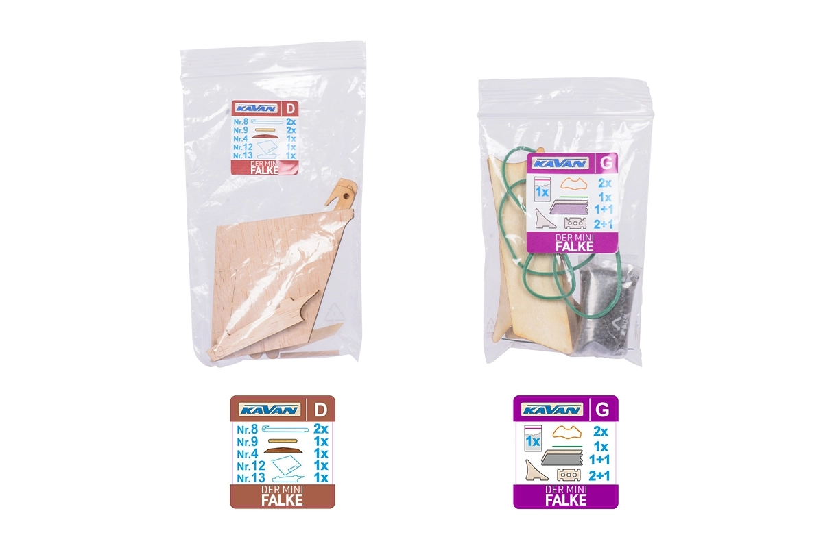 Velké celobalsové házedlo s výbornou klouzavostí a velmi jednoduchou stavbou. Je ideální jako úplně první model, který postavíte během několika desítek minut. Díky přesným laserem vyřezávaným dílům a křídlu s předbroušeným profilem si vystačíte jen s modelářským nožem, brusným papírem, acetonovým lepidlem (UHU Hart, Kanagom apod.), špendlíky, zaponovým lakem a plochým štětcem. Křídlo je k trupu upevňováno gumovými oky, takže Der Mini FALKE je i přes větší rozpětí křídla skladný; klidně si jich můžete do auta na nedělní výlet nebo dovolenou přibalit třeba několik. Ocasní plochy jsou opatřeny nastavitelnou směrovkou a výškovkou na ohebných drátových závěsech, takže zalétání a vyladění modelu je velmi snadné.