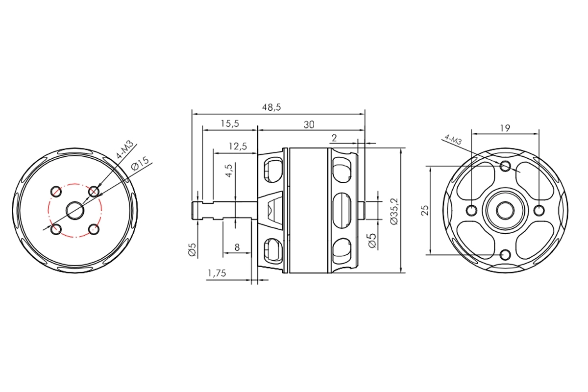 Montáž motoru: KAVAN PRO 3530-1500 je konstruován pro přední i zadní montáž. Při přední montáži za čelo motoru použijte nejméně dva (protilehlé), nebo čtyři šrouby M3, které zasahují do čela motoru v rozmezí 3,5-4 mm. Motorová přepážka by měla být z 3 mm letecké překližky. Sada pro zadní montáž (upevňovací kříž, unašeč vrtule pro zadní montáž) je dodávána spolu s motorem.