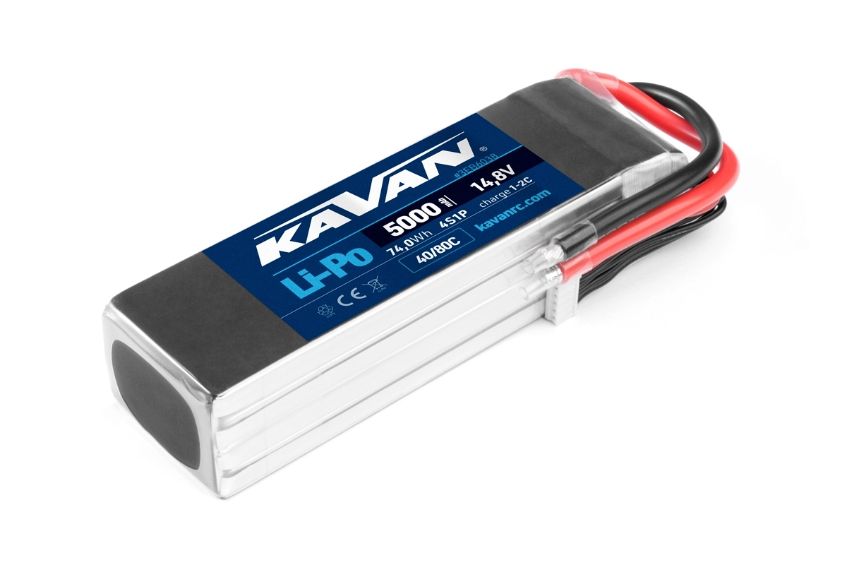 LiPo akumulátorová sada KAVAN se zvýšenou zatížitelností 40/80C, nabíjení až 2C. Čtyřčlánek 4s1p 14,8V 5000 mAh, rozměry: 139x43x37mm, hmotnost: 459g, servisní konektor JST-XH.