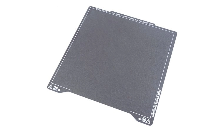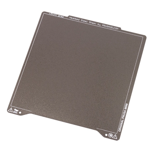 Toto je náhradní oboustranný ocelový tiskový plát se zrnitým práškovým PEI povrchem pro vyhřívanou podložku 3D tiskárny Original Prusa MINI.