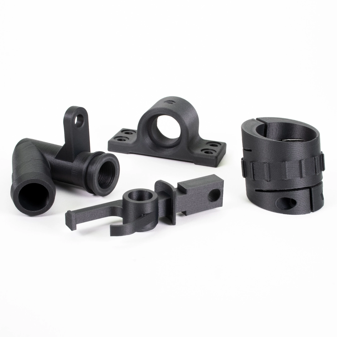 PCCF je optimální pro tisk technických komponent, vyžadujících vyšší mechanickou a teplotní odolnost. Další výhodou PCCF oproti čistému PC Blendu je možnost tisku velkých modelů bez nutnosti mít tiskárnu v Enclosure.
