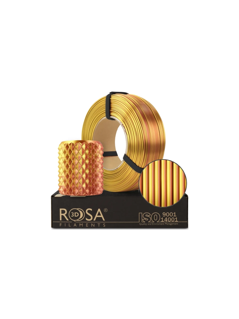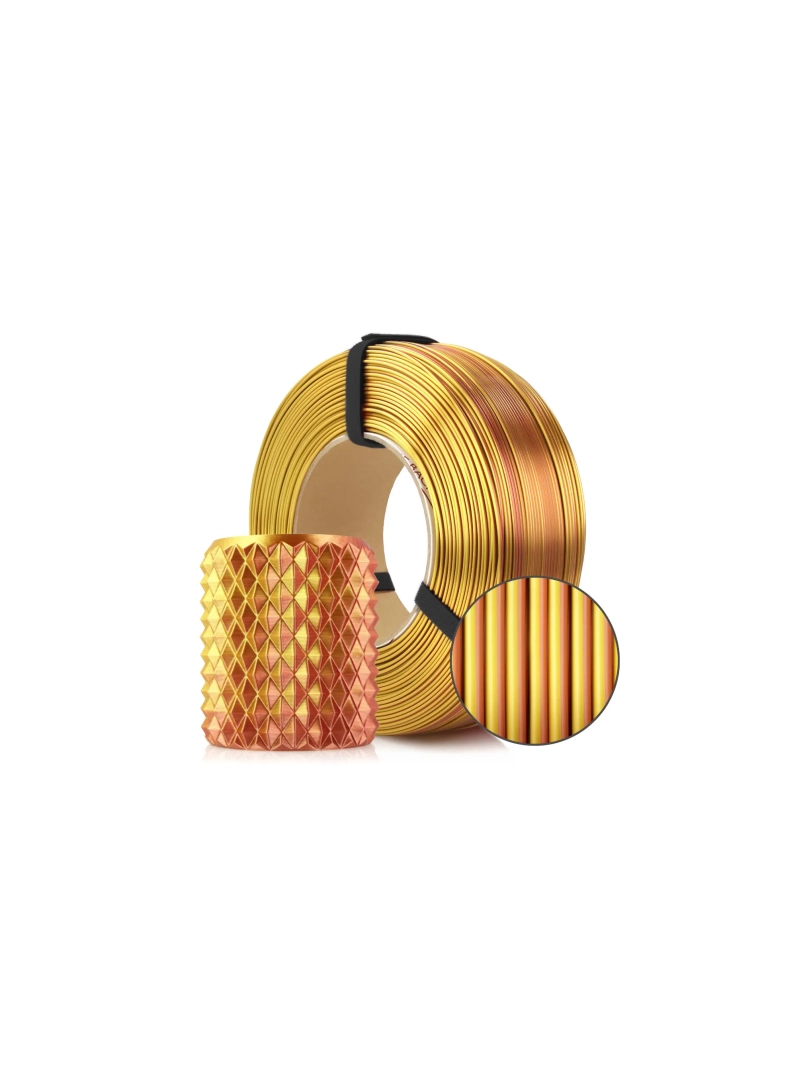 3D PLA FILAMENT Refill Magic Silk GLAMOUR je 3D tiskový materiál na bázi PLA -Silk, který kombinuje dvě barvy (zlato a měď) v jednom vlákně pomocí koextruze. Vytváří „magické“ vizuální efekty, zejména u složitých modelů se složitými detaily.