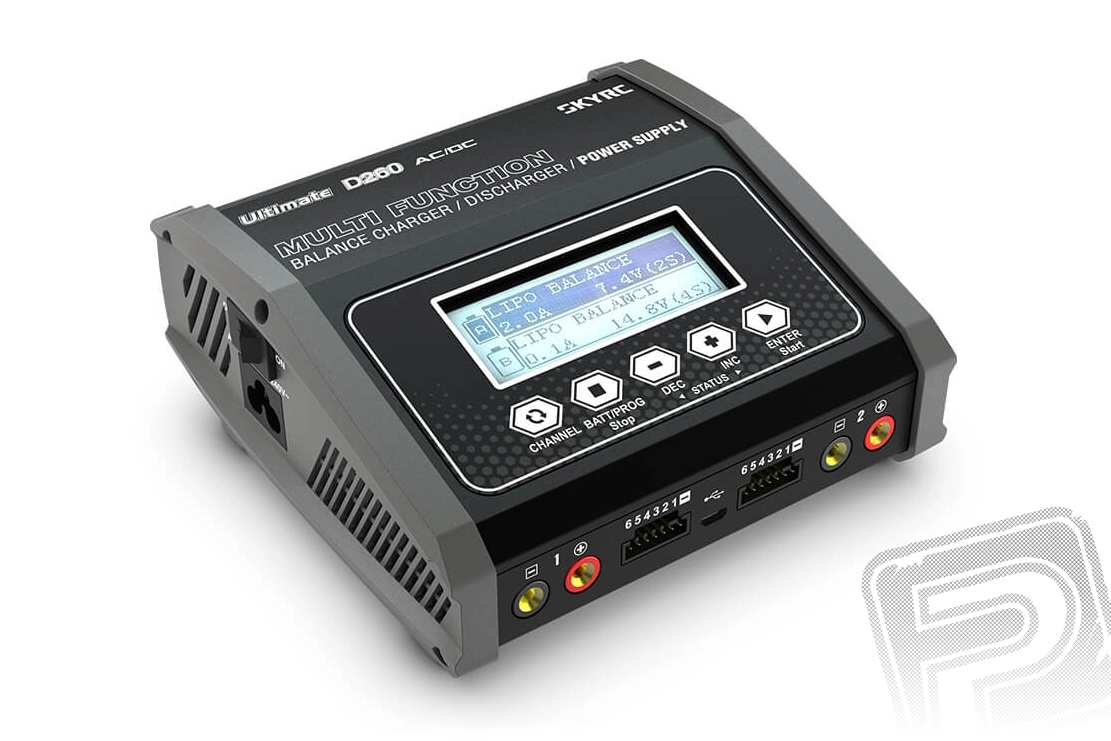 Inteligentní dvoukanálový nabíječ a vybíječ SKY RC Ultimate Duo 260W (D260) s vestavěnými balancery s výkonem až 130 W na kanál pro všechny typy akumulátorů (NiMH, NiCd, LiPo, LiHV, Li-ion, LiFe a Pb). Nabíječ je určen pro napájení ze sítě 100-240 V/50-60 Hz, z olověného akumulátoru 12 V (autobaterie nebo trakční olověný akumulátor) nebo vhodného stabilizovaného síťového zdroje (11-18 V/30 A). Na rozdíl od značné části nabíječů s vestavěným síťovým zdrojem D260 umožňuje dosahovat plného výkonu pro nabíjení i při napájení z interního síťového zdroje.