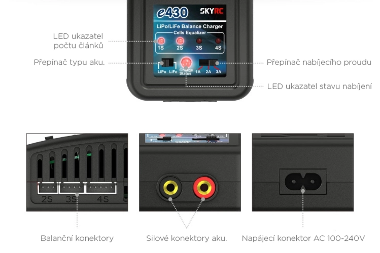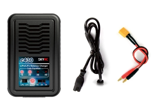 Nabíječ SKY RC e430 s vestavěným balancerem je velmi jednoduchý "krabičkový" nabíječ pro rekreační jezdce a letce se síťovým napájením pro nabíjení 2-4S LiPo a LiFe akumulátorů. Je ideálním doplňkem "setových" stavebnic umožňující jednoduché nabíjení doma nebo výborným společníkem na cesty, kdy s sebou nechcete "tahat" velký, těžký a drahý nabíječ. Výkon nabíječe je 30 W; nabíjecí proud můžete posuvným přepínačem nastavit na 1, 2 nebo 3 A.