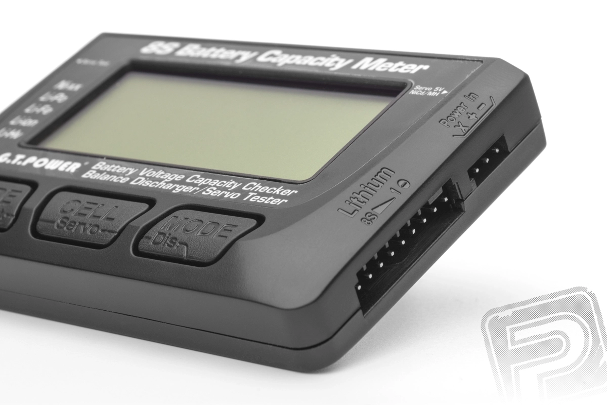 Kapesní multifunkční tester napětí s LCD displejem pro 1-8S LiPo, LiFe, Li-ion, LiHV, NiXX akumulátory, vybíječ/balancer pro lithiové akumulátory a servotester s nastavitelným rozsahem šířky impulsů a jejich opakovací frekvencí. Rozměry 82x55x16mm, hmotnost 51g.