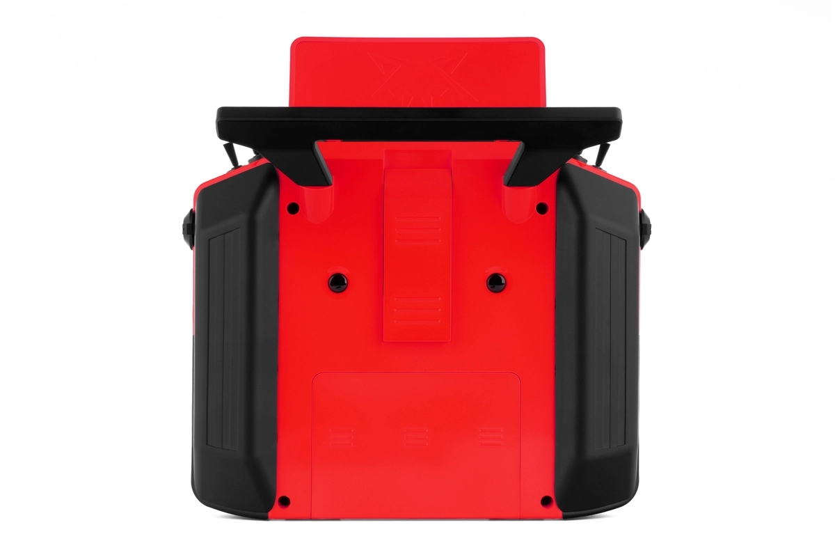 Tělo vysílače je robustní a dokonale padnoucí do ruky. Pogumované gripy na bocích a zadní straně vysílače poskytují pevný pohodlný a jistý úchop. Odtud bez obtíží dosáhnete na všechny ovladače. Gimbaly se nachází těsně u okrajů vysílače. Na komfortní držení vysílače tedy nepotřebujete ani pult. Pro maximální ergonomii lze dokoupit i dlouhé tuningové páky s přepínači.